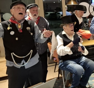 Accodeonist Ger Tempelman had weer een mooi uitgebalanceerd programma van zo’n 20 liedjes samengesteld. Veel herkenbare, wat oudere Nederlandse liedjes en natuurlijk ook een paar modernere erbij. De dames van de begeleiding doen altijd leuk mee, ook deze keer zongen en dansten ze vrolijk mee en ze maakten zelfs mooie foto’s die we uitgeprint mee mochten nemen naar huis. Ook zorgden zij ervoor dat het ons in de pauze aan niets ontbrak. In een apart zaaltje stonden precies zoveel stoelen als koorleden keurig opgesteld in een kring om de tafel. Op die tafel stonden allerlei soorten frisdrank. Maar je kon ook een glaasje wijn of biertje krijgen …. alles was mogelijk …. wat een service!