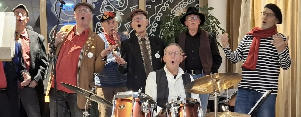 Voor ons nieuwe koorlid Bert Bos was het zijn eerste échte optreden. Met een geleende hoed en jasje van dirigent Gert Meijerink hoorde Bert en meteen al helemaal bij. Hij genoot zichtbaar van zijn debuut als koorlid van Het Torenkoor. Niet alleen Bert heeft genoten … ook alle koorleden, drummer Paul Zijlstra, accordeonist Ger Tempelman, dirigent Gert Meijerink, geluidsman Dirk Hanekamp en mediaman Andries Westerveld én …. natuurlijk de mensen in de zaal hebben een fijne, ontspannen avond gehad.