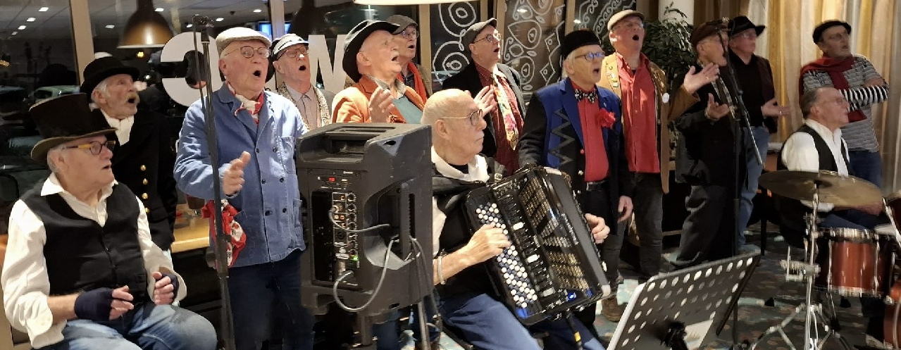 Accodeonist Ger Tempelman had weer een mooi uitgebalanceerd programma van zo’n 20 liedjes samengesteld. Veel herkenbare, wat oudere Nederlandse liedjes en natuurlijk ook een paar modernere erbij. De dames van de begeleiding doen altijd leuk mee, ook deze keer zongen en dansten ze vrolijk mee en ze maakten zelfs mooie foto’s die we uitgeprint mee mochten nemen naar huis. Ook zorgden zij ervoor dat het ons in de pauze aan niets ontbrak. In een apart zaaltje stonden precies zoveel stoelen als koorleden keurig opgesteld in een kring om de tafel. Op die tafel stonden allerlei soorten frisdrank. Maar je kon ook een glaasje wijn of biertje krijgen …. alles was mogelijk …. wat een service!